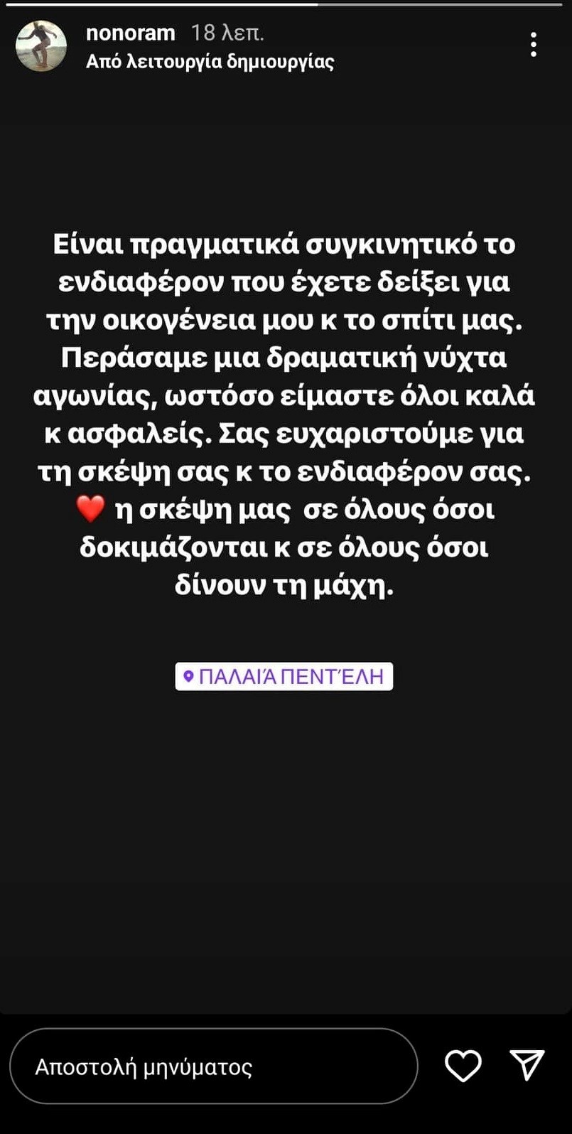 Η Ελεονώρα Μελέτη μετά τα μηνύματα που δέχτηκε από τους διαδικτυακούς της φίλους, θέλησε μέσα από τον προσωπικό της λογαριασμό στο Instagram να τονίσει πως η ίδια και η οικογένειά της είναι καλά και ασφαλείς.