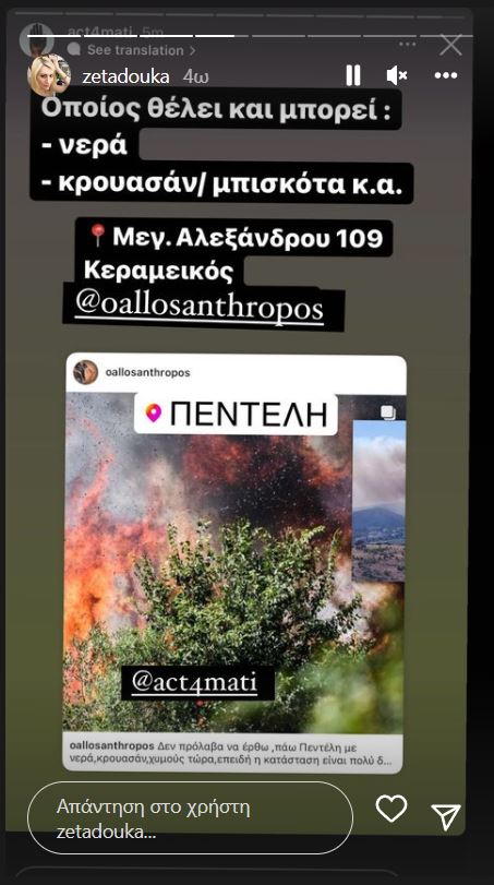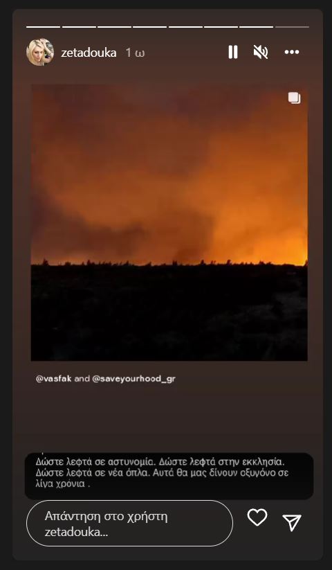 Η Ζέτα Δούκα απηύθυνε έκκληση μέσω insta story για παροχή βοήθειας στους πυροσβέστες και τους εθελοντές αλλά και στους κατοίκους της περιοχής με τρόφιμα και νερά, που αντιμετωπίζουν μία νύχτα κόλασης.