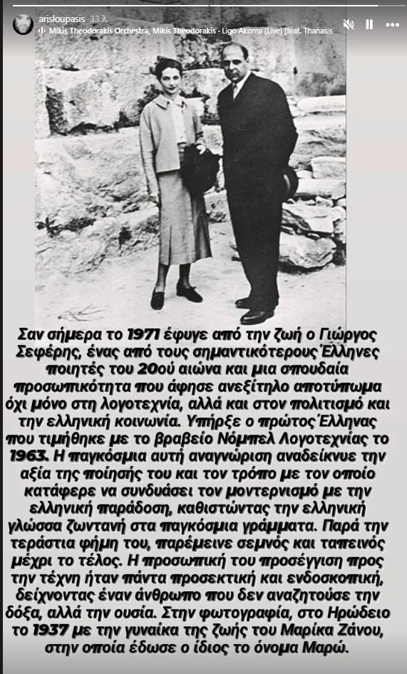 Ο Γιώργος Σεφέρης έφυγε από τη ζωή σαν σήμερα το 1971. Με αφορμή τη συμπλήρωση 53 ετών από τον θάνατο του σπουδαίου ποιητή, ο δημοσιογράφος και συλλέκτης, Άρης Λουπάσης δημοσίευσε στο Instagram μια σπάνια φωτογραφία του, στην οποία ποζάρει μαζί με τη σύζυγό του, Μαρώ, στο Ηρώδειο το 1937,