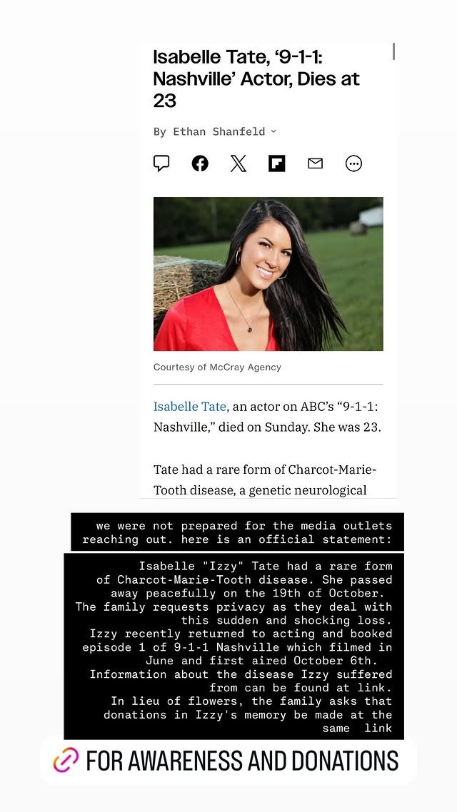 Στα 23 της χρόνια έφυγε από τη ζωή η Isabelle Tate, η ηθοποιός που λίγο πριν από τον θάνατό της είχε εξασφαλίσει τον πρώτο της ρόλο στη σειρά 9-1-1: Nashville.
