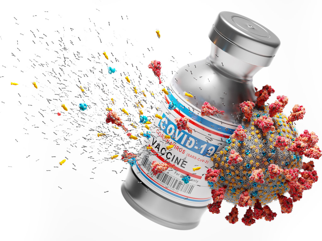 Coronavirus Covid-19 vaccine. Vaccination destroying Covid19 virus. Medicine, pharmacy