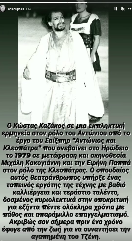 Ο Κώστας Καζάκος έφυγε σαν σήμερα το 2022 σε ηλικία 87 ετών. Με αφορμή τη συμπλήρωση ενός έτους από τον θάνατο του σπουδαίου ηθοποιού, ο δημοσιογράφος και συλλέκτης, Άρης Λουπάσης, δημοσίευσε στον προσωπικό του λογαριασμό στο Instagram μια σπάνια φωτογραφία του Κώστα Καζάκου από το έργο “Αντώνιος και Κλεοπάτρα” που ανεβαίνει στο Ηρώδειο το 1979.