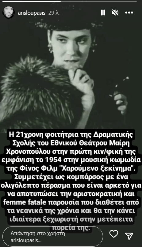 Η Μαίρη Χρονοπούλου έφυγε από τη ζωή την Παρασκευή σε ηλικία 90 ετών και ο θάνατός της έχει προκαλέσει θλίψη στο πανελλήνιο. Ο δημοσιογράφος και συλλέκτης, Άρης Λουπάσης, δημοσίευσε στον προσωπικό του λογαριασμό στο Instagram μια σπάνια φωτογραφία της σπουδαίας ηθοποιού από την πρώτη της κινηματογραφική εμφάνιση.