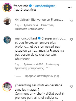 Η Marion Cotillard δεν συγκράτησε τη γλώσσα της όταν άκουσε τις δηλώσεις αυτές του Macron. Σε μια ανάρτηση στο Instagram του FranceInfo, η οποία περιείχε την ουσία των λόγων του προέδρου της Γαλλίας, η σταρ σχολίασε εκφράζοντας την απόλυτη δυσαρέσκειά της: “Σκάβοντας έναν λάκκο… και μετά σκάβοντάς τον ακόμη πιο βαθιά… και μετά δεν ξέρουμε μέχρι πού θα φτάσει… αλλά η Γαλλία σίγουρα δεν το χρειάζεται αυτό. Εκπληκτικό“, έγραψε, εμφανώς απογοητευμένη.