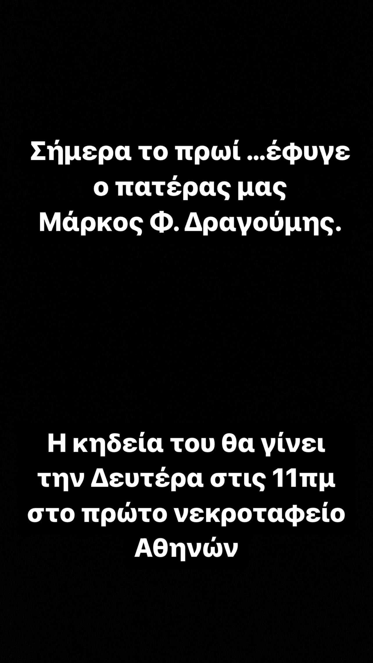 Η ηθοποιός έκανε γνωστή τη θλιβερή είδηση με Insta Story, όπου σημείωσε ότι ο πατέρας της Μάρκος Φ. Δραγούμης έφυγε από τη ζωή το πρωί της Πέμπτης. Παράλληλα, ενημέρωσε ότι η κηδεία θα γίνει τη Δευτέρα στις 11 το πρωί στο Α’ Νεκροταφείο Αθηνών.