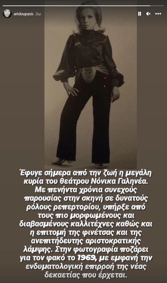 “Έφυγε σήμερα από τη ζωή η μεγάλη κυρία του θεάτρου Νόνικα Γαληνέα. Με πενήντα χρόνια συνεχούς παρουσίας στη σκηνή σε δυνατούς ρόλους ρεπερτορίου, υπήρξε από τους πιο μορφωμένους και διαβασμένους καλλιτέχνες, καθώς και η επιτομή της φινέτσας και της ανεπιτήδευτης αριστοκρατικής λάμψης. Στη φωτογραφία ποζάρει για το φακό το 1969, με εμφανή την ενδυματολογική επιρροή της νέας δεκαετίας που έρχεται”.