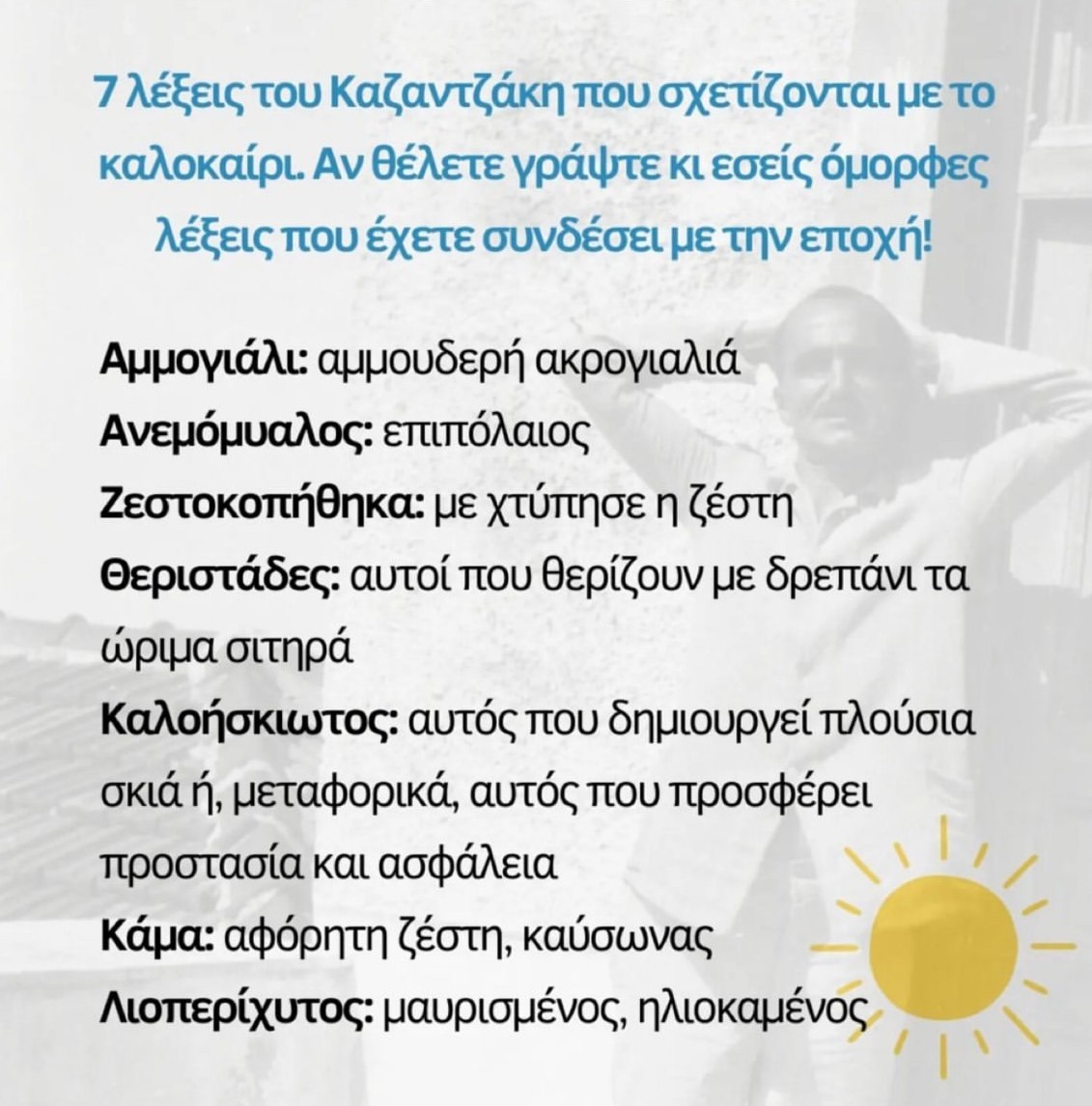 Ένα υπέροχο post κάνει τις τελευταίες ώρες τον γύρο του διαδικτύου. Πρόκειται για 7 λέξεις του Καζαντζάκη που σχετίζονται με το καλοκαίρι.