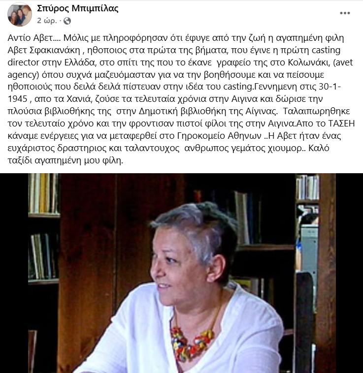 «Αντίο Άβετ…. Μόλις με πληροφόρησαν ότι έφυγε από την ζωή η αγαπημένη φίλη Άβετ Σφακιανάκη , ηθοποιός στα πρώτα της βήματα, που έγινε η πρώτη casting director στην Ελλάδα, στο σπίτι της που το έκανε γραφείο της στο Κολωνάκι, (avet agency) όπου συχνά μαζευόμασταν για να την βοηθήσουμε και να πείσουμε ηθοποιούς που δειλά δειλά πίστευαν στην ιδέα του casting. Γεννημένη στις 30-1-1945 , απο τα Χανιά, ζούσε τα τελευταία χρόνια στην Αίγινα και δώρισε την πλούσια βιβλιοθήκης της στην Δημοτική βιβλιοθήκη της Αίγινας.