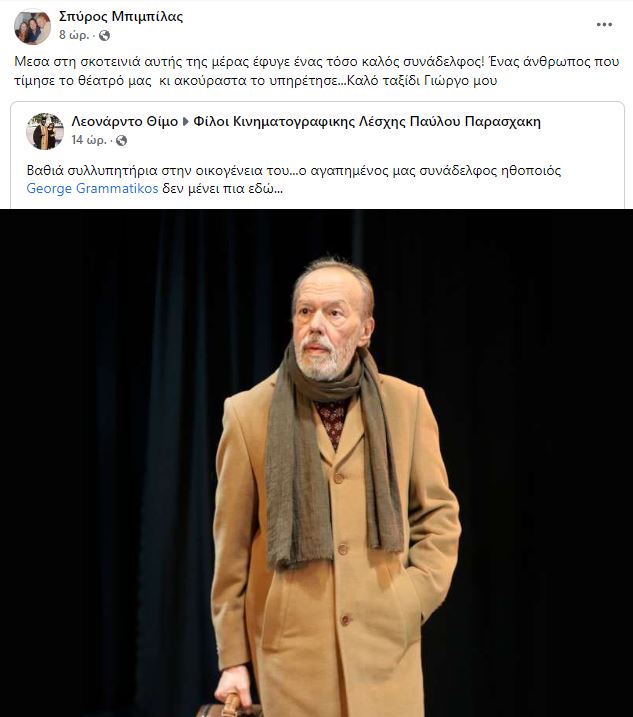Ο Σπύρος Μπιμπίλας έγραψε στο “αντίο” του για τον συνάδελφό του: “Μεσα στη σκοτεινιά αυτής της μέρας έφυγε ένας τόσο καλός συνάδελφος! Ένας άνθρωπος που τίμησε το θέατρό μας κι ακούραστα το υπηρέτησε…Καλό ταξίδι Γιώργο μου“