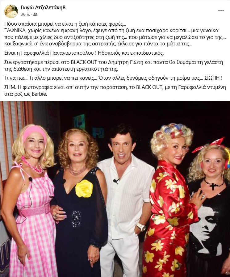 ΣΗΜ. Η φωτογραφία είναι απ’ αυτήν την παράσταση, το BLACK OUT, με τη Γαρυφαλλιά ντυμένη στα ροζ ως Barbie”, έγραψε η Γωγώ Ατζολετάκη στην ανάρτησή της στον προσωπικό της λογαριασμό στο Facebook.