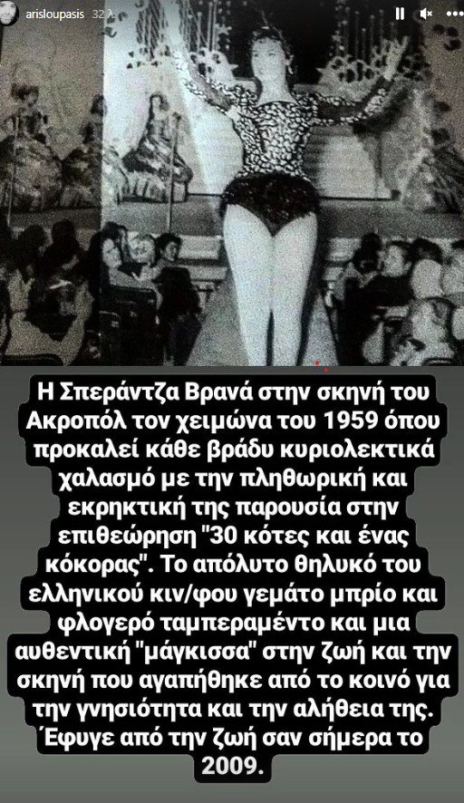 “Η Σπεράντζα Βρανά στην σκηνή του Ακροπόλ τον χειμώνα του 1959, όπου προκαλεί κάθε βράδυ κυριολεκτικά χαλασμό με την πληθωρική και εκρηκτική της παρουσία στην επιθεώρηση “30 κότες και ένας κόκορας”. Το απόλυτο θηλυκό του ελληνικού κινηματογράφου γεμάτο μπρίο και φλογερό ταμπεραμέντο και μια αυθεντική “μάγκισσα” στην ζωή και την σκηνή που αγαπήθηκε από το κοινό για τη γνησιότητα και την αλήθεια της. Έφυγε από τη ζωή σαν σήμερα το 2009″.