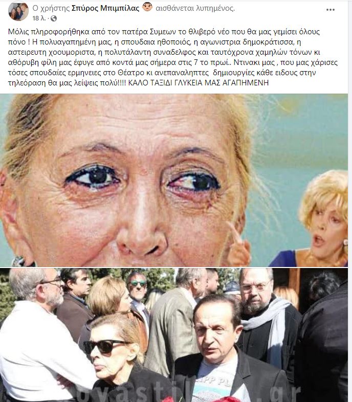 Ο Σπύρος Μπιμπίλας, πρόεδρος του ΣΕΗ, ενημέρωσε με ανάρτησή του στο facebook ότι η γνωστή ηθοποιός έφυγε από τη ζωή στις 7 το πρωί.