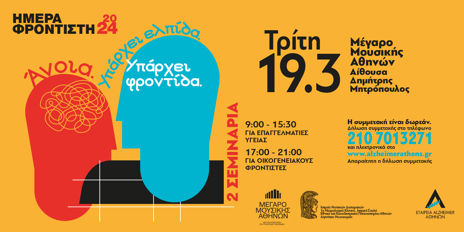 Την Τρίτη 19 Μαρτίου 2024, με αφορμή την Ημέρα Φροντιστή ατόμων με άνοια, η Εταιρεία Alzheimer Αθηνών, το Ιατρείο Νοητικών Διαταραχών της Νευρολογικής Κλινικής του Αιγινήτειου Νοσοκομείου ΕΚΠΑ και το Μέγαρο Μουσικής Αθηνών, ενώνουν τις δυνάμεις τους στη διοργάνωση μιας ολοήμερης ημερίδας που θα ρίξει φως στις περισσότερες πτυχές του μείζονος ιατρικού και κοινωνικού θέματος της άνοιας.