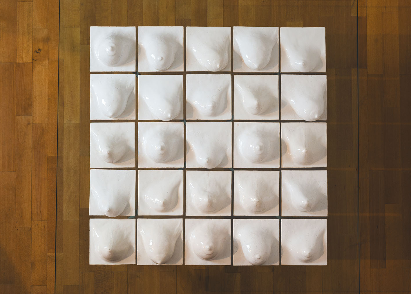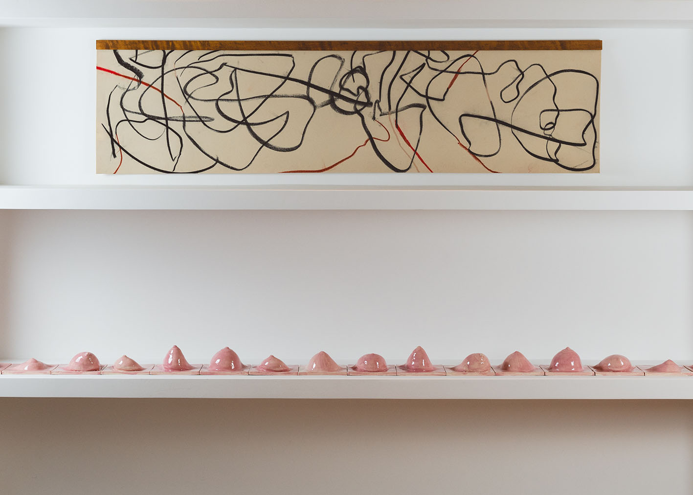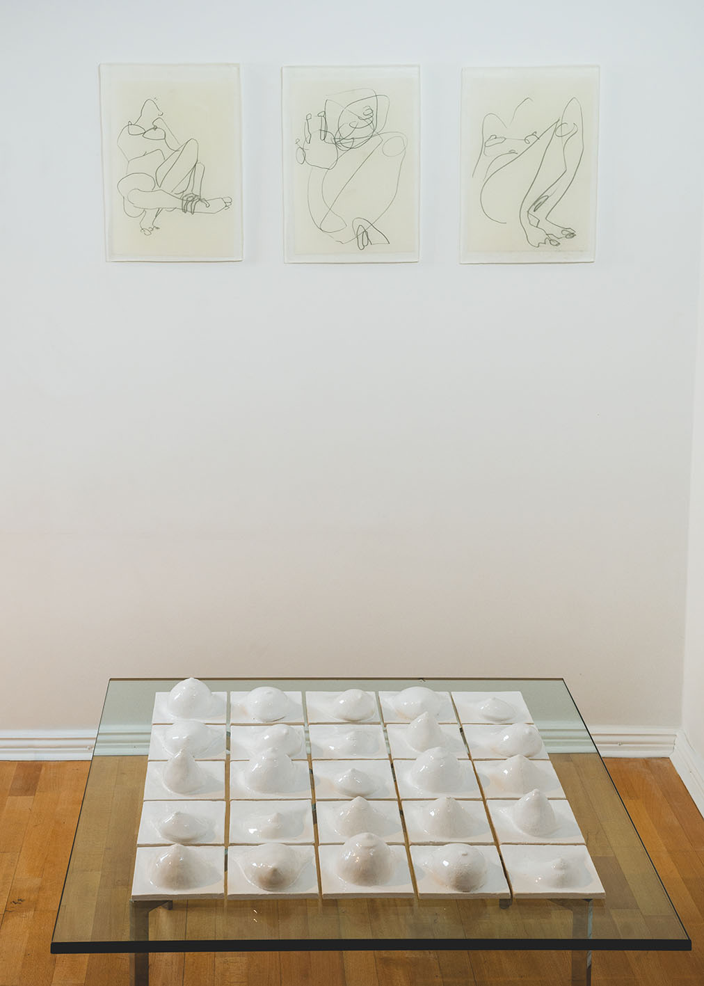 Η έκθεση Blushing out of Blue παρουσιάζει νέα και ειδικά για τον χώρο έργα. Από ντελικάτα σχέδια έως κεραμικά γλυπτά. Αποτελούν έκφραση της ευαισθησίας της καλλιτέχνιδος για τη δημιουργία μιας ξεχωριστής γλώσσας με σχήματα, αισθήσεις και εξερεύνηση της υλικότητας. Και έτσι δίνει νόημα στις γνήσιες αισθήσεις που υπάρχουν μέσα από τη σωματική ύπαρξη.