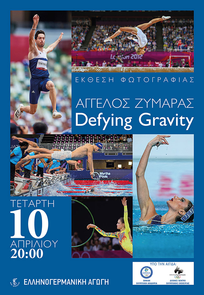 Η έκθεση «Defying Gravity» περιλαμβάνει φωτογραφίες Ελλήνων αθλητών που έχουν λάβει μέρος σε Ολυμπιακούς Αγώνες στο παρελθόν καθώς και αθλητών που θα εκπροσωπήσουν τη χώρα μας στους Ολυμπιακούς Αγώνες του 2024, στο Παρίσι. Με τον φωτογραφικό του φακό ο Άγγελος Ζυμάρας αιχμαλωτίζει και παρουσιάζει στιγμιότυπα της αγωνιστικής προσπάθειας σπουδαίων Ελλήνων αθλητών και μας ταξιδεύει νοερά στη σύγχρονη ιστορία των Ολυμπιακών Αγώνων.