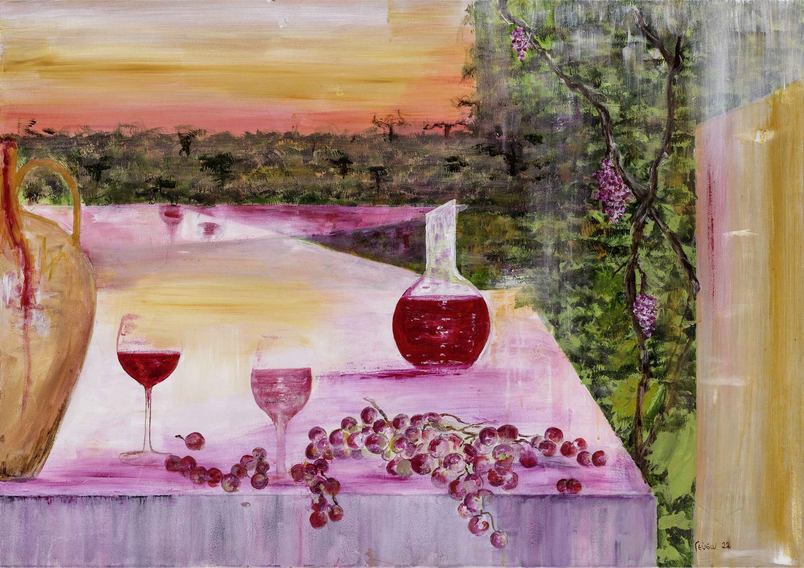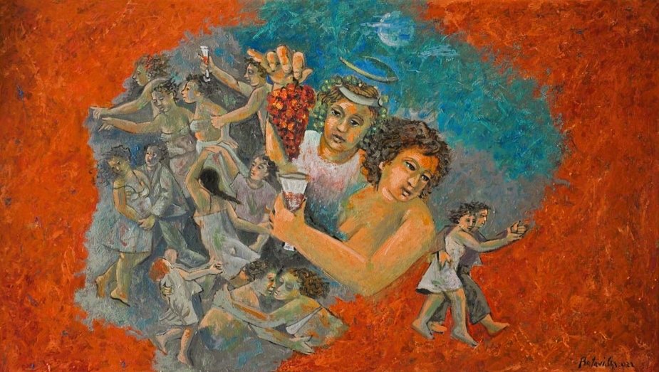 «Οι καλλιτέχνες φιλοτεχνούν έργα σύμφωνα με τις προσωπικές τους γραφές και διαπραγματεύονται την ίδια θεματική σε διάφορες εκφάνσεις. Οι εικαστικές δημιουργίες δεν περιορίζονται μόνον σε ζωγραφικά έργα αλλά επεκτείνονται και σε άλλες μορφές τέχνης με κατασκευές και εγκαταστάσεις. Η εικονογραφία τους είτε συμβολική, είτε ανεικονική, είτε ρεαλιστική ή υπερρεαλιστική παραπέμπει εννοιολογικά στη λατρεία του οίνου μέσα από αναφορές στον άγιο με τα ανθρώπινα πάθη».