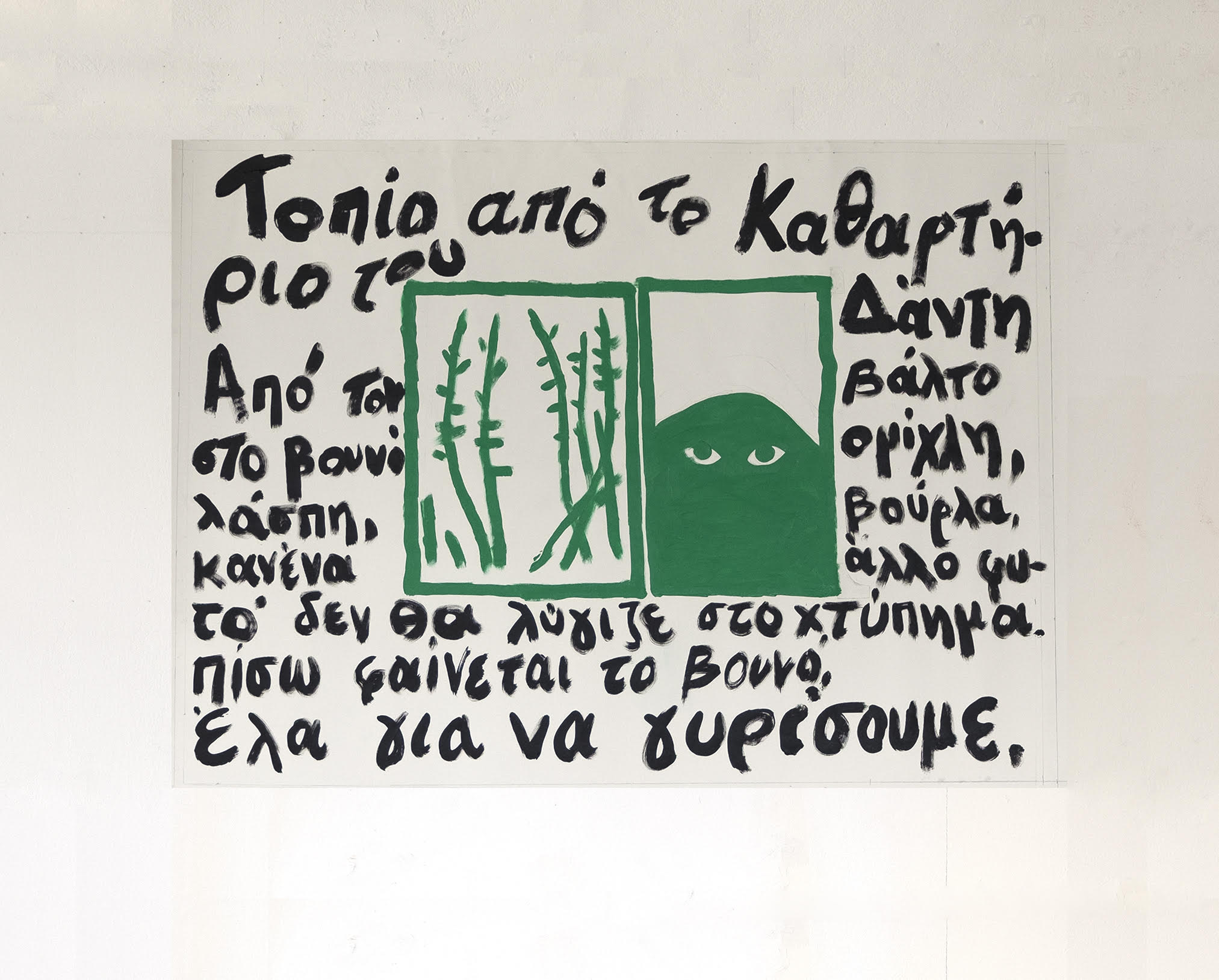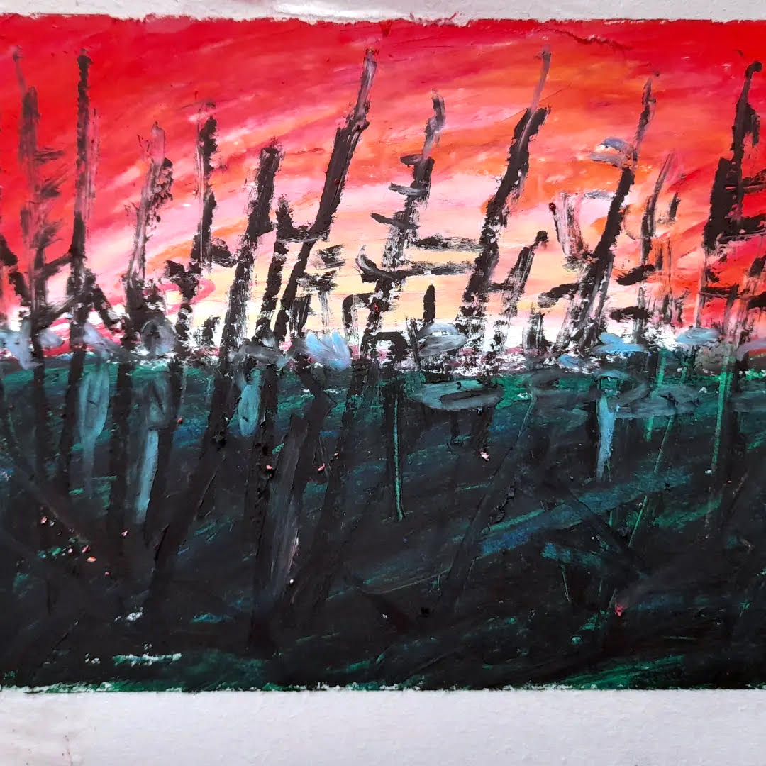 Στην έκθεση, ο καλλιτέχνης σχολιάζει την ανθρώπινη επέμβαση σε περιοχές όπου η φύση παραμένει ευάλωτη και ανεξερεύνητη. Η τεχνοτροπία του αντλεί έμπνευση από την παράδοση των πρώιμων γραφικών τεχνών, με έργα που θυμίζουν μεγάλες ξυλογραφίες. Τα αυστηρά περιγράμματα και η περιορισμένη χρωματική παλέτα – με έντονες αναφορές σε μελάνια – συνθέτουν ένα προσωπικό ύφος που συνδυάζει τη χαρακτική και τη ζωγραφική. Στο χώρο της γκαλερί, συστάδες από καλάμια επεκτείνονται στο φυσικό περιβάλλον του εκθεσιακού χώρου, δημιουργώντας μια δυναμική αντίθεση που προκαλεί το θεατή να αναρωτηθεί αν πρόκειται για δειλινό ή για το αποτέλεσμα μιας κοσμικής έκρηξης.