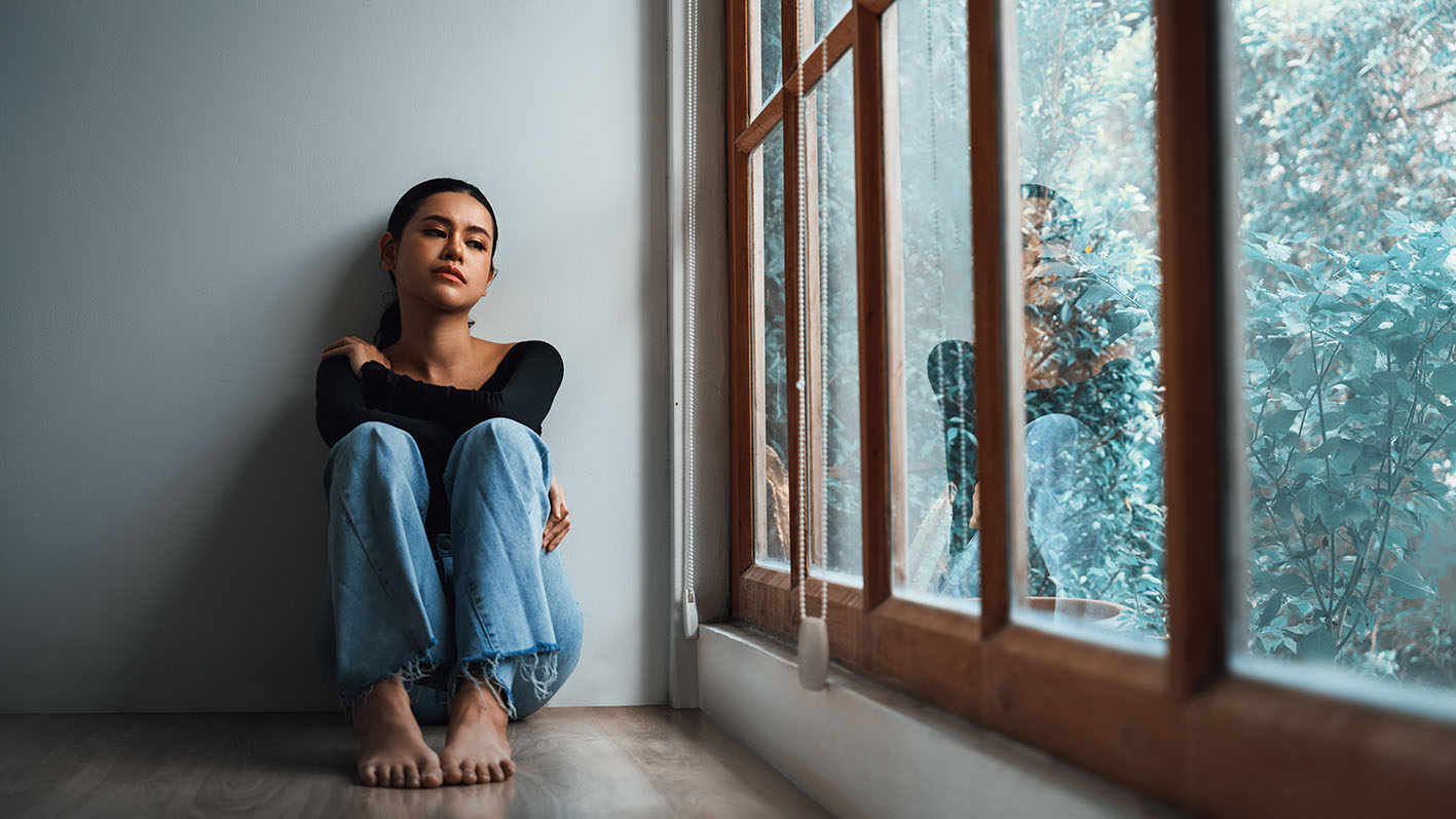 Λυπημένη γυναίκα μόνη δίπλα σε παράθυρο
