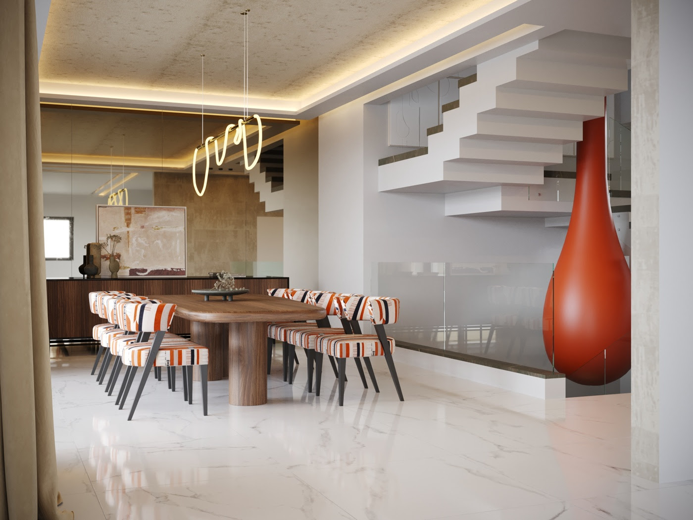 Η τραπεζαρία της βίλας είναι ένας χώρος που γεννήθηκε για να ενώνει για να τιμά τη στιγμή και να προκαλεί ουσιαστικές συζητήσεις. Με μίνιμαλ ύφος και ταυτόχρονα επιβλητική, προσκαλεί να απολαύσεις κάθε γεύμα σαν μια μικρή τελετουργία.
