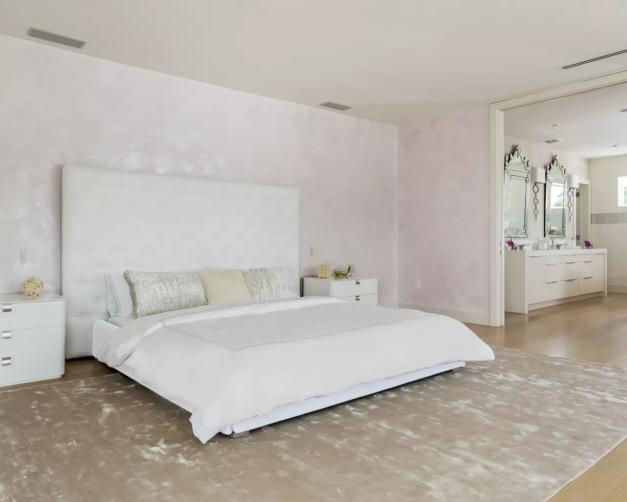 Τα υπνοδωμάτια είναι ευρύχωρα, διακοσμημένα σε πιο ανοιχτούς τόνους όπως το υπόλοιπο σπίτι. Για άλλη μια φορά, η μινιμαλιστική προσέγγιση φαίνεται μέσα από τη μικρή ποσότητα επίπλων που γεμίζει την κρεβατοκάμαρα. Ωστόσο, είναι ένας κομψός και μοντέρνος χώρος.
