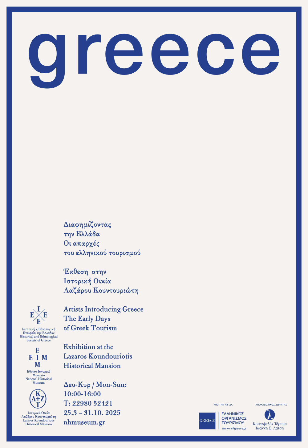 Η Ιστορική και Εθνολογική Εταιρεία της Ελλάδος παρουσιάζει την έκθεση «Διαφημίζοντας την Ελλάδα. Οι απαρχές του ελληνικού τουρισμού» στην Ιστορική Οικία Λαζάρου Κουντουριώτη, παράρτημα του Εθνικού Ιστορικού Μουσείου στην Ύδρα. Η έκθεση ανοίγει για το κοινό στις 25 Μαρτίου, ενώ τα επίσημα εγκαίνια θα πραγματοποιηθούν τον Ιούνιο, στο πλαίσιο του θεσμού των Μιαουλείων. Η έκθεση θα διαρκέσει έως τις 31-10-2025.