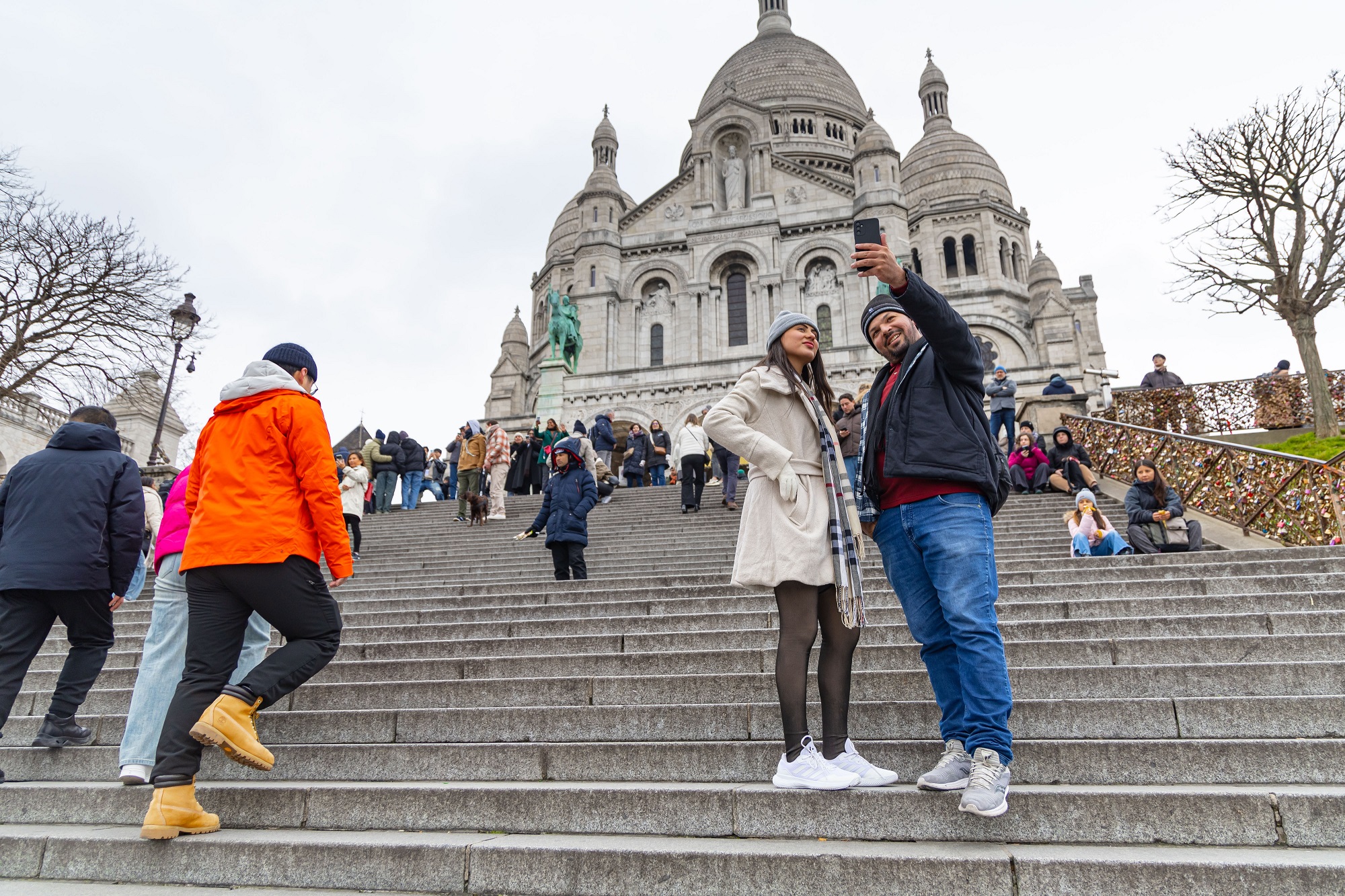 Τουρίστες περπατούν κοντά στη Βασιλική Sacre-Coeur στη Μονμάρτρη στο Παρίσι, 7 Φεβρουαρίου 2025