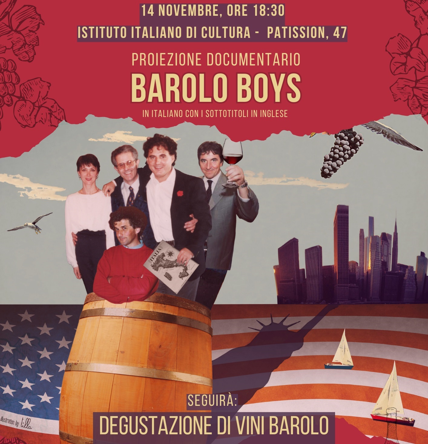 Θα γίνει προβολή του ντοκιμαντέρ «Barolo Boys», στα ιταλικά με αγγλικούς υπότιτλους, και στη συνέχεια θα ακολουθήσει καθοδηγούμενη γευσιγνωσία Barolo, στα ελληνικά, με τις Σταματίνα Καλλιθρακά, καθηγήτρια Οινολογίας – ΓΠΑ και Οινογνωσίας ιταλικών οίνων – ΕΑΠ και Μαριάνθη Μπασαλέκου, επίκουρη καθηγήτρια Βιομηχανικής Χημείας – Οίνος και Αλκοολούχα Ποτά – ΕΚΠΑ