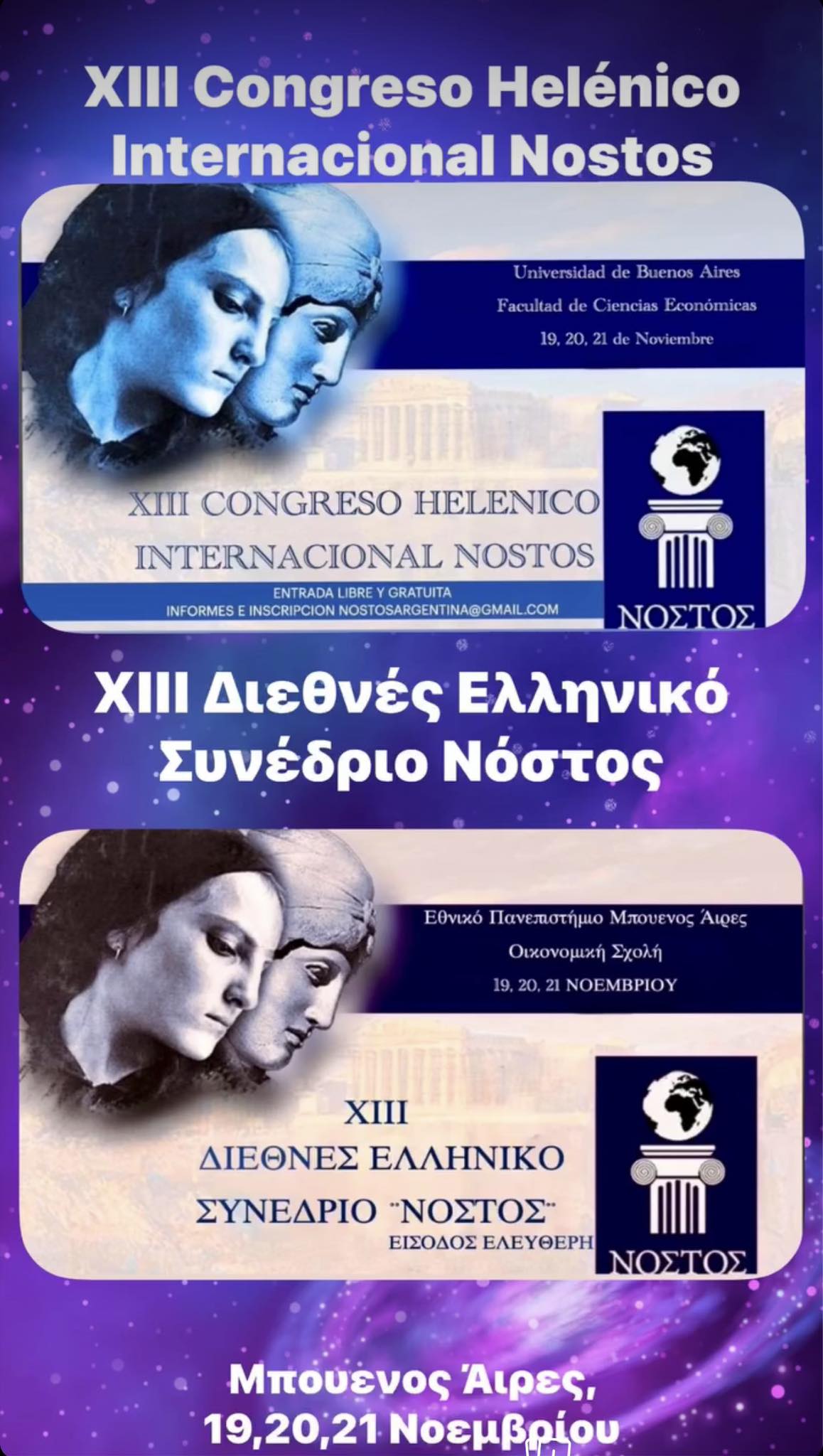 Το XIII Διεθνές Συνέδριο «Νόστος», που θα πραγματοποιηθεί στις 19, 20, και 21 Νοεμβρίου 2024 στην αίθουσα εκδηλώσεων της Σχολής Οικονομικών Επιστημών του Πανεπιστημίου του Μπουένος Άιρες, διοργανώνει η Ελληνική Πολιτιστική Οργάνωση «Νόστος», υπό την αιγίδα της Ιεράς Αρχιεπισκοπής Μπουένος Άιρες και Νοτίου Αμερικής, της Πρεσβείας της Ελλάδας στην Αργεντινή, του Πάντειου Πανεπιστήμιου, της Πανελλήνιας Ομοσπονδίας Κοινοτήτων της Αργεντινής, του Οργανισμού για τη Διάδοση της Ελληνικής Γλώσσας (ΟΔΕΓ) και της Διεθνούς Εταιρείας Φίλων του Νίκου Καζαντζάκη.
