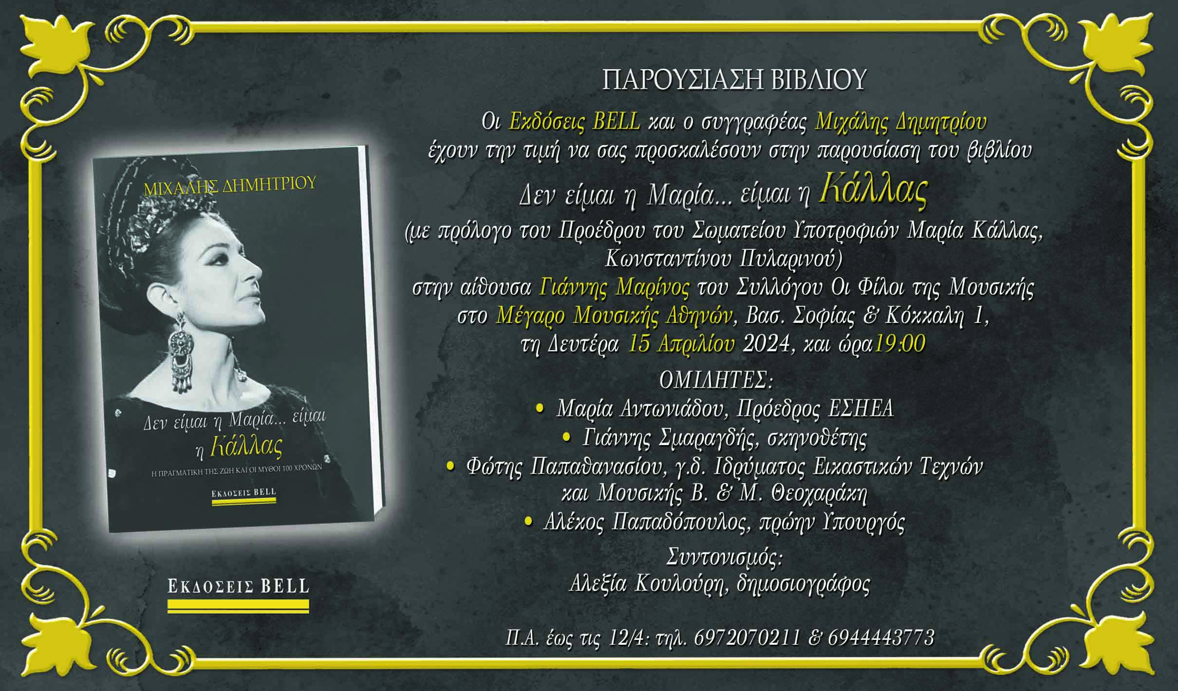 H παρουσίαση του βιβλίου “Δεν είμαι η Μαρία… είμαι η Κάλλας” του Μιχάλη Δημητρίου, που κυκλοφορεί από τις Εκδόσεις Bell, θα γίνει στο Μέγαρο Μουσικής τη Δευτέρα 15 Απριλίου 2024, στις 19:00.