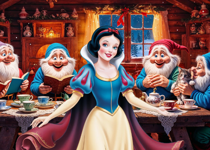 Η Χιονάτη, η πριγκίπισσα με τη λευκή σαν το χιόνι επιδερμίδα και τα μαύρα σαν τον έβενο μαλλιά, κερδίζει τις καρδιές των Επτά Νάνων και ζει μαζί τους στο σπιτάκι του Δάσους.