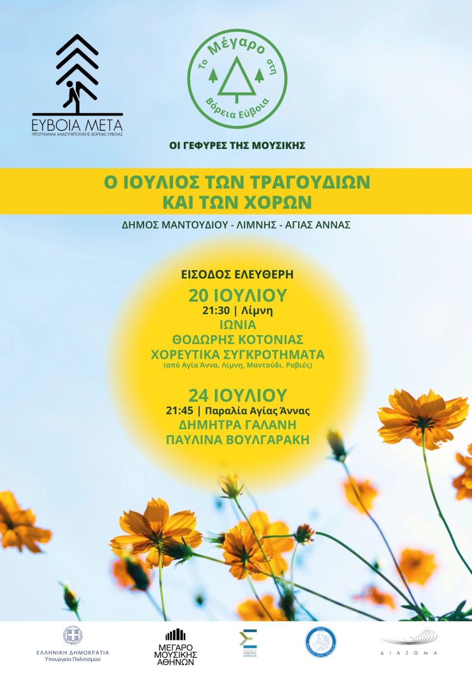Με τη γιορτή της μουσικής και του χορού, που είναι αφιερωμένη στην παράδοση, αρχίζει ο φετινός «Ιούλιος των τραγουδιών και των χορών», ο οποίος πραγματοποιείται στο πλαίσιο του προγράμματος «Το Μέγαρο στη Βόρεια Εύβοια‒Οι Γέφυρες της Μουσικής» και στοχεύει στην πολιτιστική αναζωογόνηση της περιοχής.