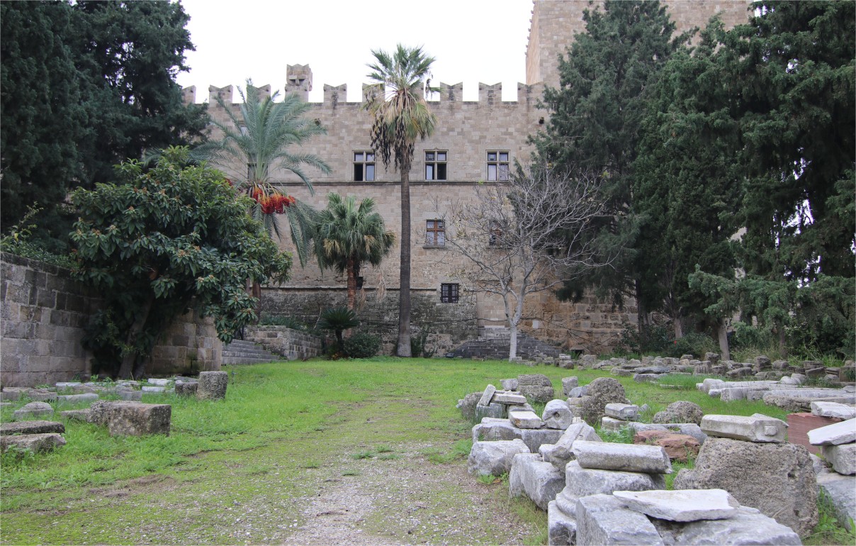 Το Παλάτι βρίσκεται στην περιοχή της πρωτοβυζαντινής ακρόπολης στο βόρειο άκρο της πόλης, ενσωματώνοντας τμήματα της σε ύστερη μεσαιωνική κατασκευή. Τα βυζαντινά κατάλοιπα διατηρούνται έως το ισόγειο. Ο βορειοδυτικός πύργος περιλαμβάνει ελληνιστικά στοιχεία, πιθανόν τη βάση του Κολοσσού της Ρόδου. Κατά την Ιπποτική περίοδο, από το 1309, το Παλάτι λειτουργούσε ως διοικητικό κέντρο του Τάγματος των Ιωαννιτών, με σημαντικές ανακατασκευές έως τον 15ο αιώνα. Μετά την οθωμανική πολιορκία του 1480 και τον σεισμό του 1481, έγιναν εκτεταμένες επισκευές. Η διάταξη της ιπποτικής περιόδου περιελάμβανε ισόγειο και όροφο, με πύργους και εξωτερικό τείχος. Η οθωμανική πολιορκία του 1522 προκάλεσε σοβαρές καταστροφές, και το Παλάτι δεν αποκαταστάθηκε στην αρχική του μορφή. Κατά τις επόμενες δεκαετίες, το Παλάτι παρέμεινε σε χρήση, αρχικά ως φυλακή για πρίγκιπες και αργότερα για γενικούς κρατούμενους. Το 1856, σεισμός και έκρηξη πυρίτιδας κατέστρεψαν τον όροφο και μεγάλο μέρος του ισογείου.