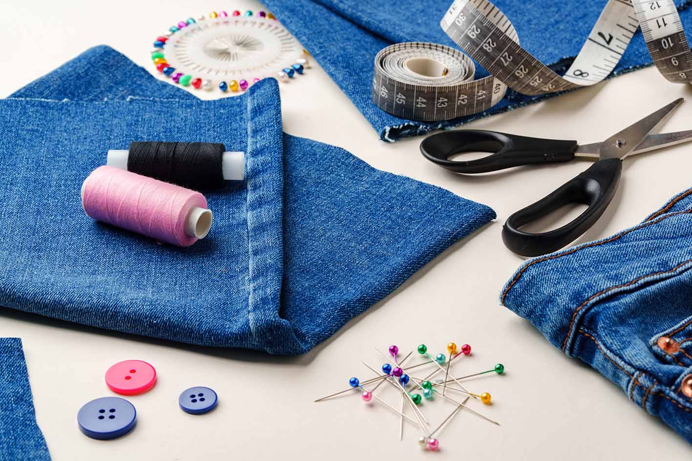 Είδη ραπτικής και ύφασμα τζιν τοποθετημένα σε χώρο εργασίας για μεταποιήσεις ρούχων σε φωτεινό περιβάλλον από κοντά