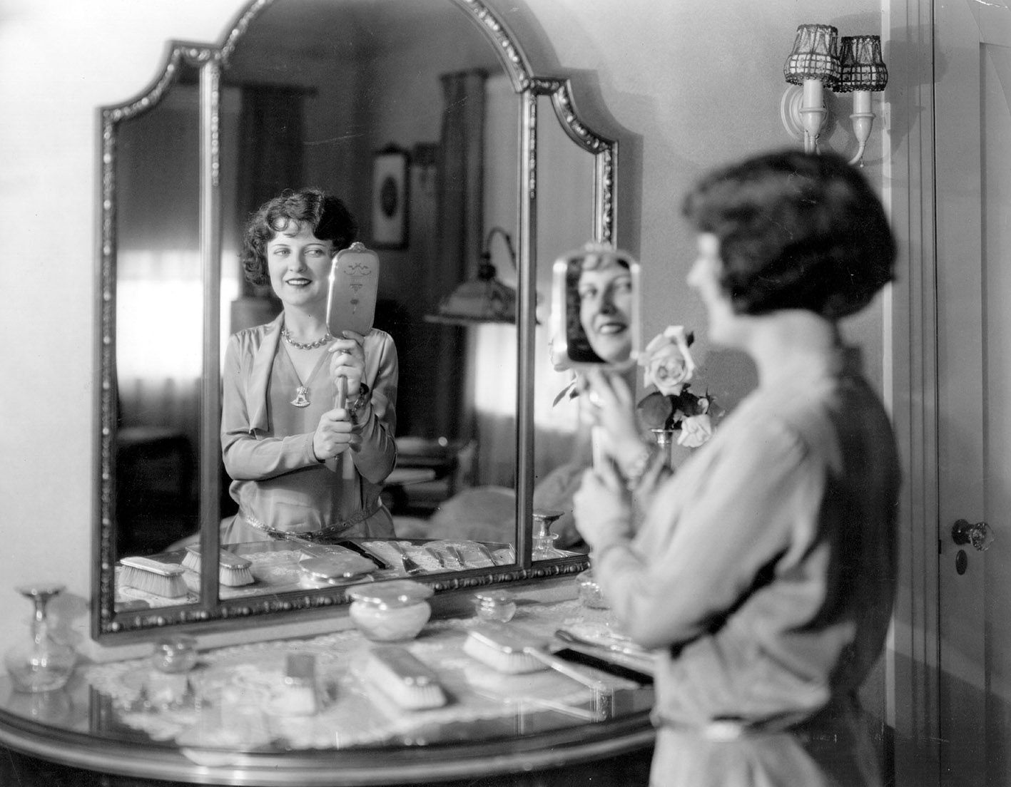 Η May McAvoy, η Αμερικανίδα πρωταγωνίστρια του βωβού κινηματογράφου, απεικονίζεται στο καμαρίνι της, χαμογελώντας στην αντανάκλασή της στους πολλούς καθρέφτες, συμπεριλαμβανομένου ενός που κρατάει στο χέρι της.