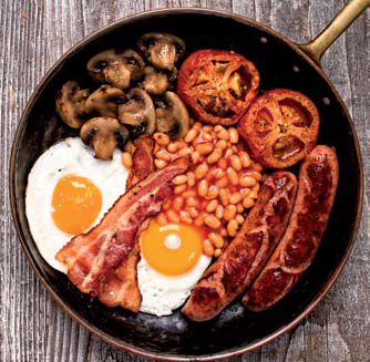 Το ενισχυμένο αγγλικό πρωινό περιλαμβάνει αβγά, λουκάνικα, μπέικον, φασόλια, μανιτάρια και μαγειρεμένη ντομάτα.