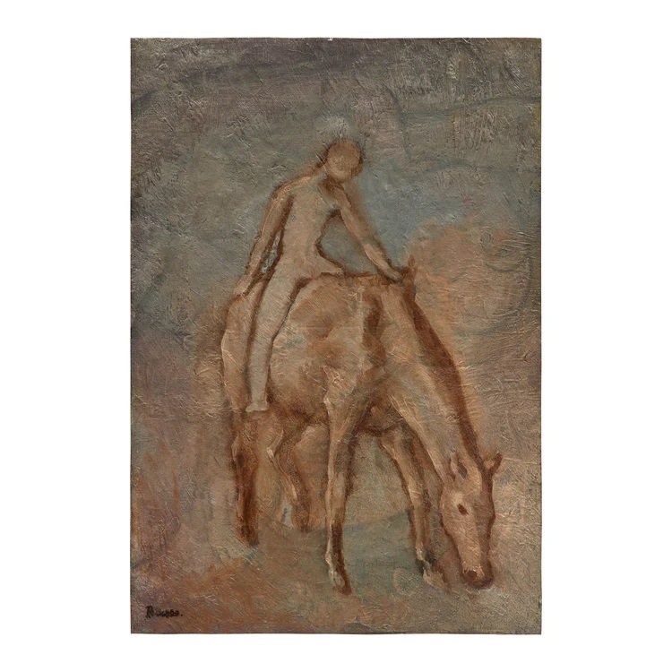Η εξερεύνηση των ζώων από τον Πικάσο γίνεται ακόμη πιο πολυεπίπεδη και πολύπλοκη στις ελαιογραφίες του. Ο πίνακας Jeune Garçon nu à cheval (1906), είναι ένα σπάνιο και εξαιρετικό παράδειγμα από τη Ροζ Περίοδο, μια φάση που χαρακτηρίζεται από ζεστασιά, τρυφερότητα και μια ορισμένη αισιοδοξία σε αντίθεση με την προηγούμενη Μπλε Περίοδο. Η σπουδαιότητα του πίνακα υπογραμμίζεται περαιτέρω από τη σύνδεσή του με το L’Abreuvoir (Ο τόπος ποτίσματος) (1906), μια φιλόδοξη, ανεκπλήρωτη σύνθεση που ο Πικάσο διερεύνησε μέσω πολλαπλών μελετών (η πληρέστερη από τις οποίες φιλοξενείται σήμερα στο Μητροπολιτικό Μουσείο Τέχνης της Νέας Υόρκης).