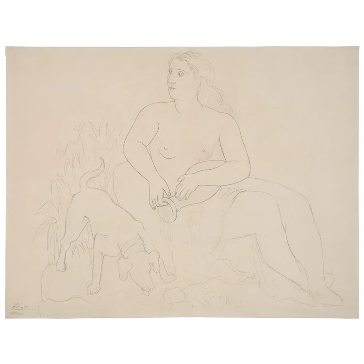 Το Femme au chien, ένα σχέδιο με μολύβι του 1921, αντανακλά την επιστροφή του Πικάσο στις κλασικές ιδεολογίες μετά τις φρικαλεότητες του Α’ Παγκοσμίου Πολέμου. Η λεπτή αλλά ταυτόχρονα σίγουρη και σταθερή γραμμή προσδίδει μια γλυπτική παρουσία στη σύνθεση, τονίζοντας την ήσυχη αλλά βαθιά σύνδεση μεταξύ των μορφών. Τα σκυλιά στο έργο του Πικάσο ενσαρκώνουν τη συντροφικότητα, την αφοσίωση και το ένστικτο, που συχνά απεικονίζονται με παιχνιδιάρικη διάθεση.