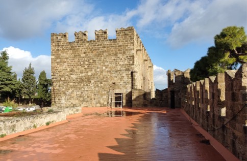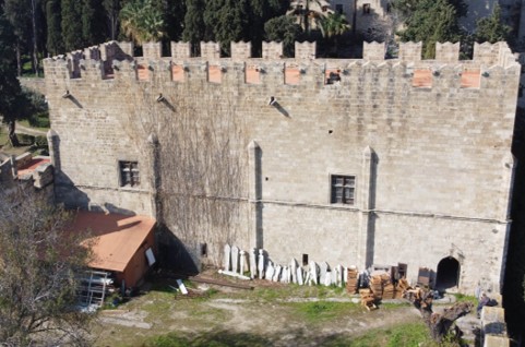Σύμφωνα με το υπουργείο Πολιτισμού, το κτηριακό συγκρότημα έχει σύνθετη οικοδομική ιστορία, ενώ η σημερινή εικόνα του οφείλεται σε μεγάλο βαθμό σε εργασίες ανακατασκευής κατά την περίοδο της Ιταλοκρατίας. Το βόρειο κτήριο, με επιφάνεια 320 τ.μ., εφάπτεται στην υποδομή της βόρειας οχύρωσης. Το ισόγειο αποτελείται από δυο θολωτές αίθουσες, η νότια με ενδιάμεσους πεσσούς, ενώ ο όροφός του από μια αίθουσα ύψους 7,20 μ., που χωρίζεται με κεντρική τοξοστοιχία σε δυο κλίτη και επιστέφεται από ξύλινη επίπεδη οροφή. Εντός του πάχους της τοιχοποιίας του ανατολικού τοίχου αναπτύσσεται κλίμακα που οδηγεί στο δώμα.