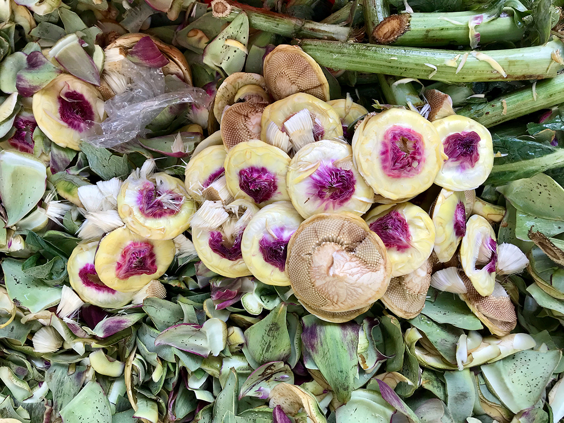 • Κάθε αγκινάρα που καθαρίζουμε, τη βάζουμε σε μπολ με νερό και αρκετό χυμό λεμονιού, για να μη μαυρίσει.