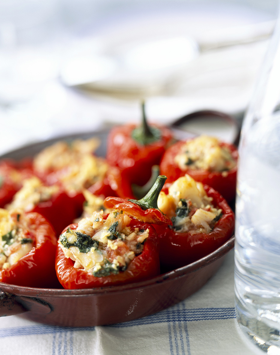 • Γεμίζουμε απαλά τις πιπεριές με το μείγμα, καλύπτουμε με τα «καπάκια» τους και τις τοποθετούμε σε πυρίμαχο σκεύος. Περιλούζουμε με το υπόλοιπο λάδι και ψήνουμε σε καλά προθερμασμένο φούρνο στους 180°C για 30-45 λεπτά.