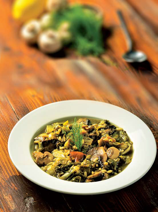 • Βράζουμε για 45 λεπτά προσθέτοντας ζωμό όταν χρειάζεται. Το τελευταίο πεντάλεπτο προσθέτουμε τον ψιλοκομμένο άνηθο και αλατοπιπερώνουμε.