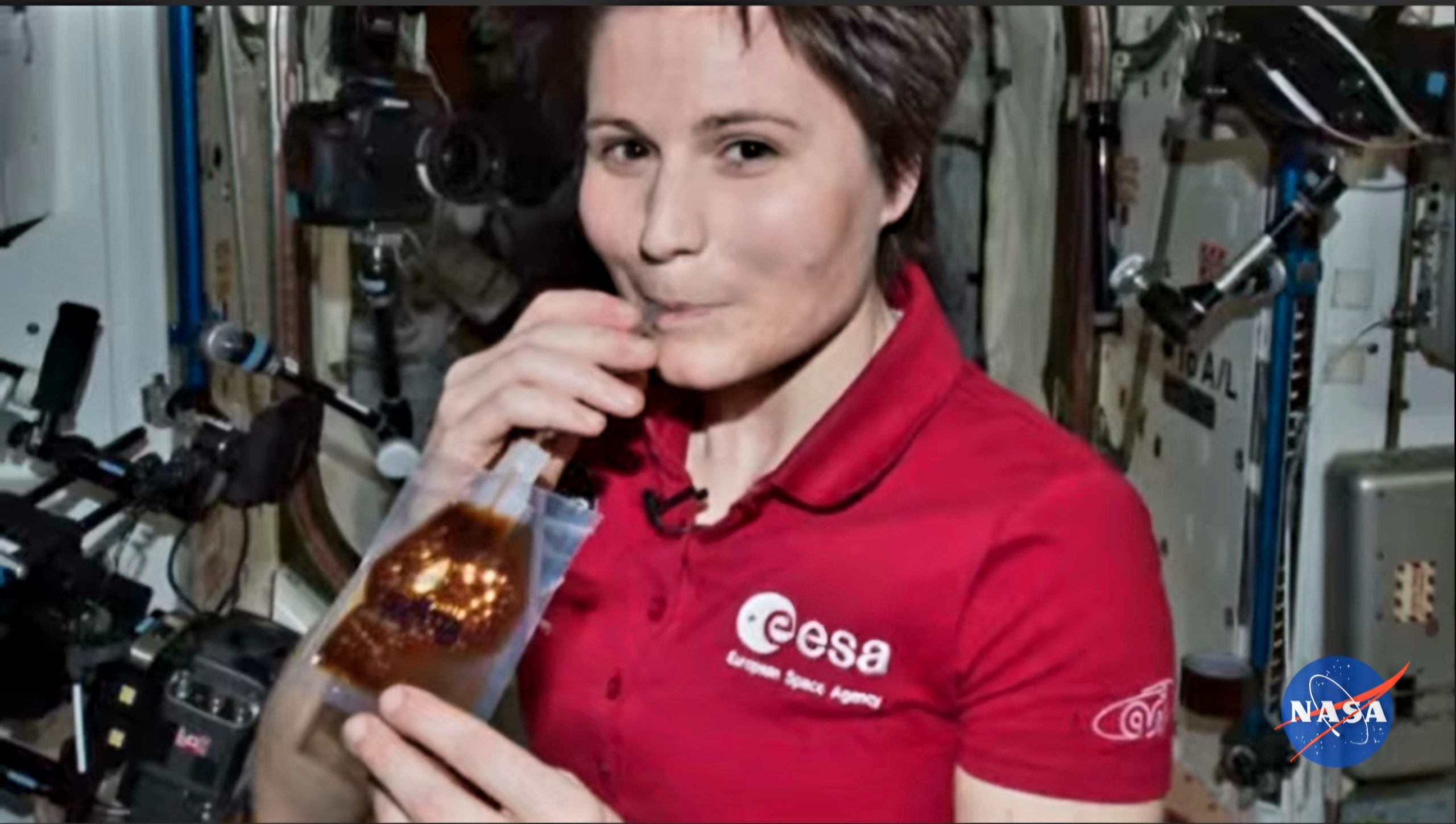 Στη φωτογραφία η αστροναύτης Νικόλ Μαν, βάζει καφέ από ένα φιαλίδιο σαν σακούλα στην κούπα. Την ανακινεί ελαφρά ανακατεύοντας και μας δείχνει πως ο καφές δεν χύνεται από την κούπα για να αιωρηθεί, όπως έχουμε δει να συμβαίνει σε τόσα βίντεο από διαστημικούς σταθμούς.