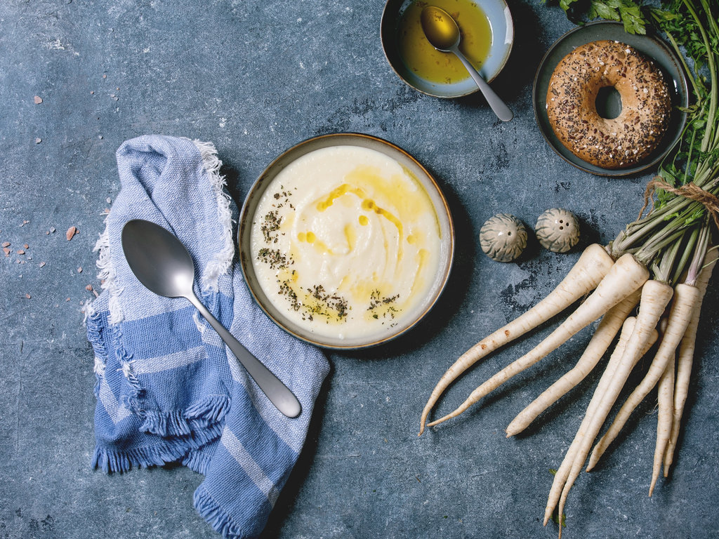 Συνοδέψτε τη σούπα από παστινάκι με ζεστό αφράτο bagel. Προσθέστε βούτυρο για έξτρα νοστιμιά.