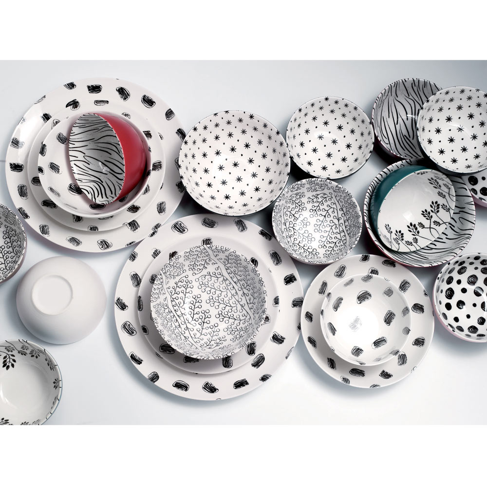 Διαλέξτε ανάμεσα στο σετ χρωματιστών πιάτων σε κίτρινο, ροζ, μπλε με ανάγλυφη διακόσμηση, σε κεραμικά και πορσελάνη, 18 τεμαχίων, στο σετ μοντέρνων χειροποίητων πιάτων σε λευκή πορσελάνη με διακόσμηση σε 18 σχέδια και στο σετ από 6 πιατάκια και 6 μπολ για ορεκτικά ή απεριτίφ, με μοντέρνο και πολύχρωμο σχεδιασμό σε χρωματιστά κεραμικά.