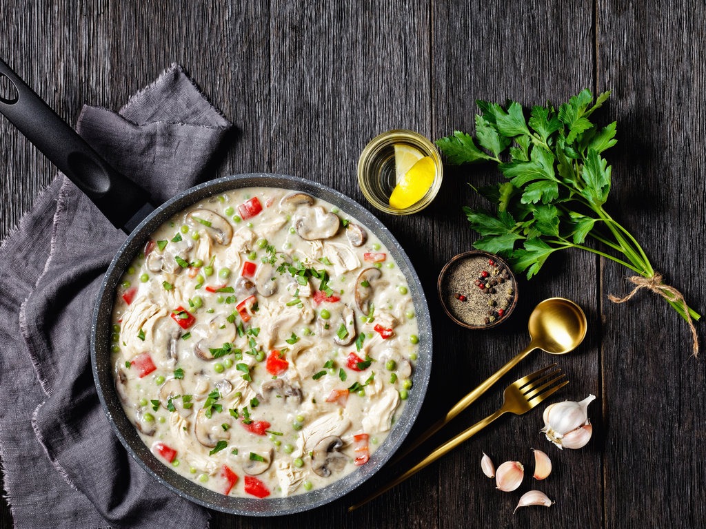 à la King (α-λα-κινγκ) – Παρασκευάζεται με σάλτσα μπεσαμέλ που περιέχει μανιτάρια, πράσινες πιπεριές και κόκκινες ή πιπεριές πιμέντο.