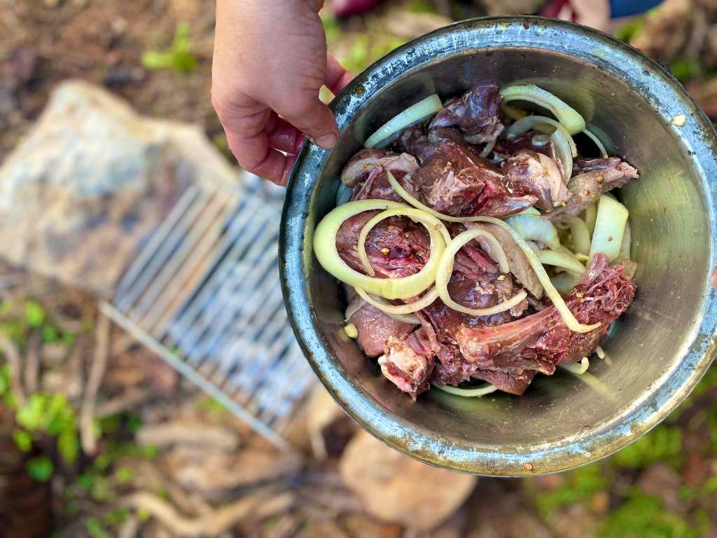 “Η μαρινάδα που σας προτείνω είναι πολύ απλή αλλά να ξέρετε ότι τόσο τα άφθονα κρεμμύδια, όσο και το μηλόξυδο λειτουργούν σαν καταλύτες τρυφεροποίησης και γεύσης πάνω στο αγριογούρουνο”.
