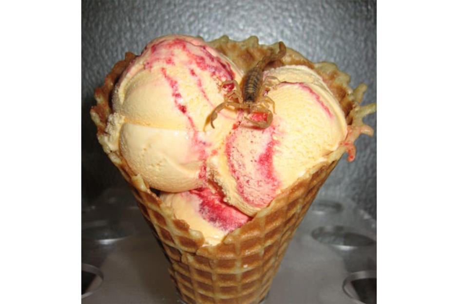 Αυτό το παγωτό ακούγεται φανταστικό: ένα γλυκό, τραγανό χωνάκι γεμάτο από μπάλες βανίλιας εμπλουτισμένες με χυμό πορτοκαλιού, μάνγκο και φράουλα. «Πού είναι η παγίδα;», αναρωτιέστε. Ερχεται γαρνιρισμένο με έναν σκορπιό. Ναι, αληθινό σκορπιό.