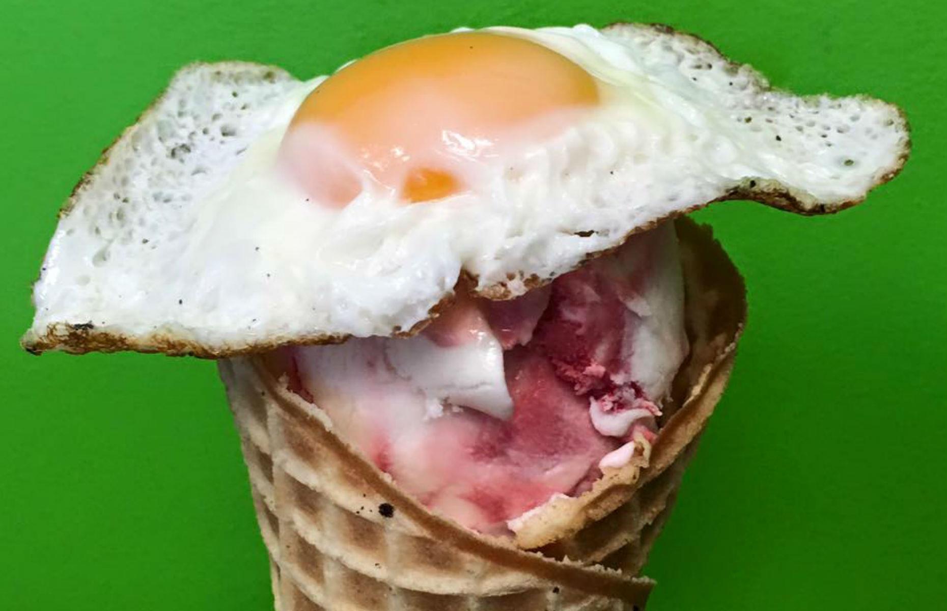 Τα sunny side eggs των αγγλόφωνων δεν είναι άλλα από τα αβγά-μάτια που πολύ καλά γνωρίζουμε και αγαπάμε στην Ελλάδα. Τώρα φανταστείτε το νόστιμο παγωτό μπέικον, που συναντήσαμε προηγουμένως στο Ντελαγουέρ, με ένα ολόκληρο τηγανητό αβγό από πάνω. Το «Sweet Action Ice Cream» στο Ντένβερ του Κολοράντο αποφάσισε να προσφέρει αυτόν τον συνδυασμό σε χωνάκι βάφλας, για ένα πλήρες πρωινό γεύμα. Μπορεί να μορφάζετε λίγο, αλλά μην το απορρίψετε πριν το δοκιμάσετε!