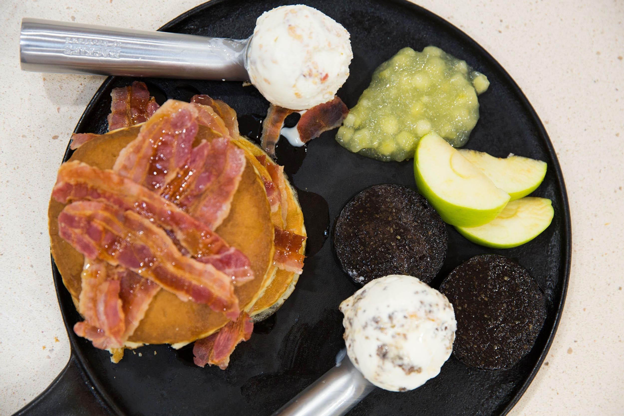 Αν δεν σας αρκούν μόνο το μπέικον και τα αβγά στο παγωτό σας, η εταιρεία «Mackie’s of Scotland» έφτιαξε ένα με γεύση πλήρους πρωινού. Αντλώντας έμπνευση από το τυπικό αμερικανικό και το αγγλικό πρωινό, έμπλεξε τις γεύσεις του πανκέικ, του μπέικον και της μαύρης πουτίγκας για να ετοιμάσει μια νόστιμη, μικρή παγωμένη μπάλα!