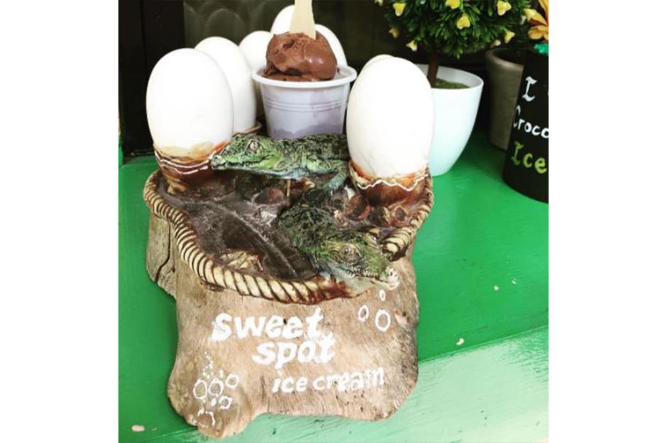 Ναι, και εμείς είμαστε έκπληκτοι. Αυτό το παγωτατζίδικο στο Νταβάο των Φιλιππίνων προσφέρει παγωτό από αβγά κροκοδείλου. Μπορείτε να το βρείτε στο Davao’s Crocodile Park, το οποίο είναι ένας μικρός ζωολογικός κήπος και ταυτόχρονα μια φάρμα κροκοδείλων.